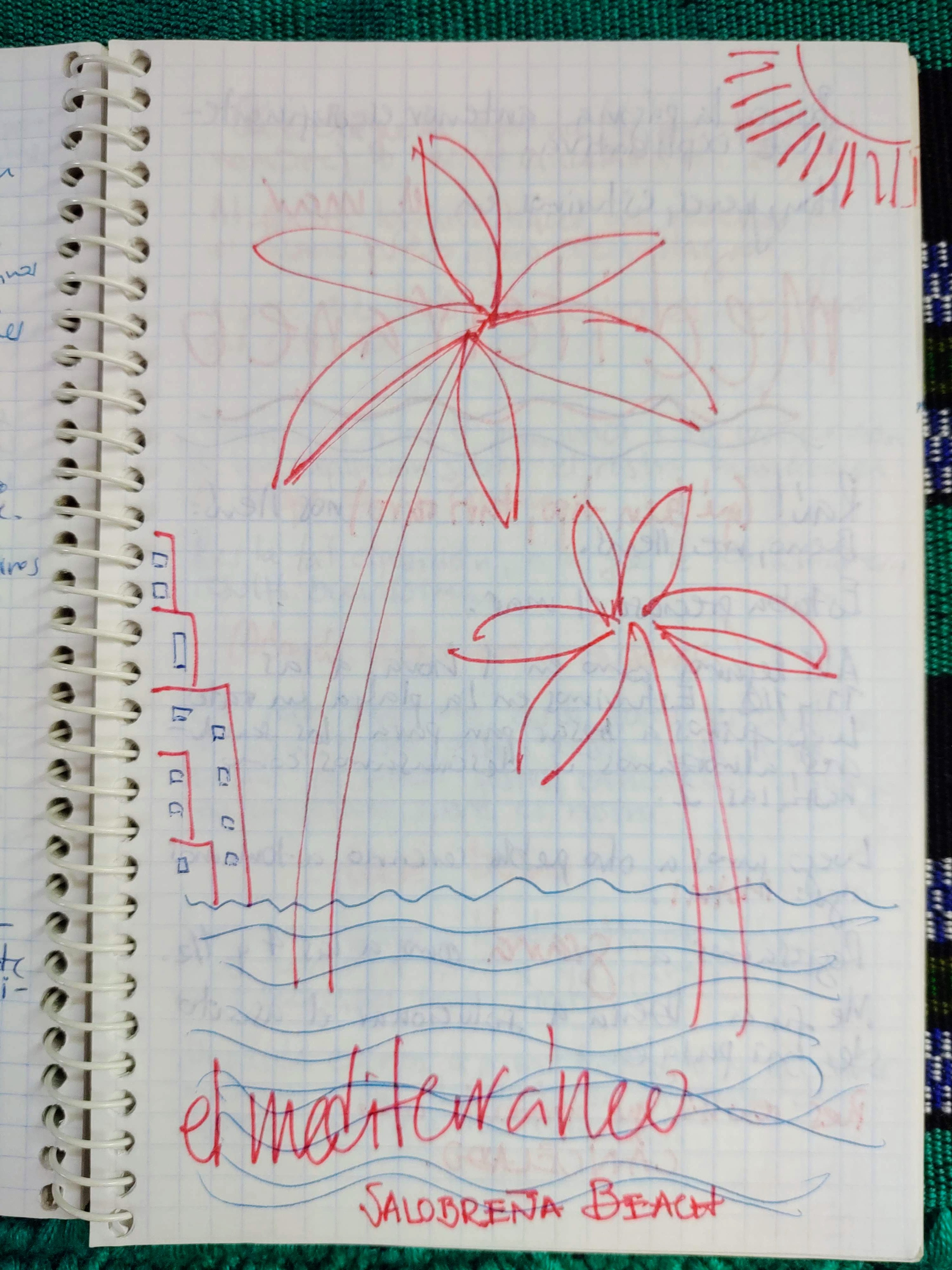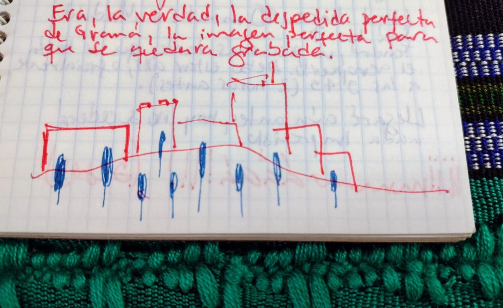 De aquel cuadernito en el que escribí hace ya 21 años leí hoy (ayer ya) unas páginas, que no valían la pena ser leídas. Hacia el final de las páginas escritas estaba lo que escribí en Andalucía –en Granada y en una playa pequeña a la que fui y cuyo nombre, ya verás, ahora sé. Me encontré dos pequeños dibujos simples que comparto contigo, a manera de deseo de que muchas cosas tengan para ti en este viaje una cierta belleza sencilla que intuyo que te gusta.